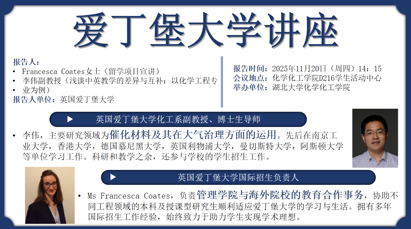 11月20日,英国爱丁堡大学工程学院李伟副教授与国际招生负责人Francesca Coates女士来访我们,就联合培养项目开展宣讲交流。活动由学院党委副书记刘莹主持。活动分为两个环节。首先,李伟副教授以化学工程专业为例,系统介绍了中英高等教育在课程设计理念、课程内容设置、教学模式和考核评价方式等方面的差异性,强调了国际化教育在培养学生创新思维和实践能力方面的重要作用,并鼓励同学们拓展国际视野,助力个人成长与发展。...