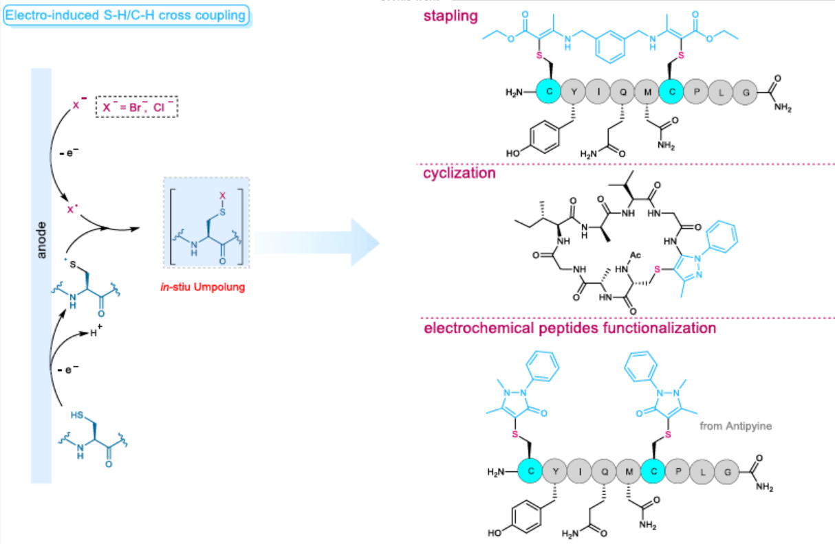 本研究工作创新型的通过电化学原位极性反转策略实现了半胱氨酸侧链巯基S-H的氧化偶联反应,极大的拓展和丰富了现有的半胱氨酸修饰方法,并利用该策略成功的实现了半胱氨酸的大环化反应,构建出了一系列结构新颖的环肽骨架,为环肽的合成提供了新的思路。