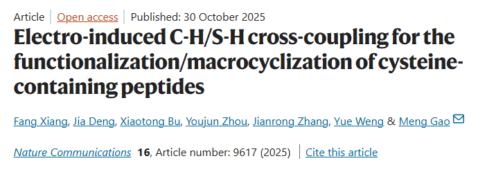 近日,威廉希尔足球官网高梦副教授团队在国际期刊《Nature Communications》发表题为《Electro-induced C-H/S-H Cross-Coupling for the Functionalization/Macrocyclization of Cysteine-Containing Peptides》的研究成果。https://www.nature.com/articles/s41467-025-64615-4。williamhill官网为第一单位,硕士研究生向芳为论文第一作者,williamhill官网高梦副教授为唯一通讯作者(图1)。