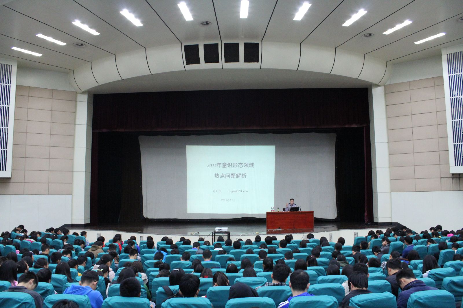 本次课程主题为“2015年意识形态领域热点问题解析”。高教授从意识形态的两级性和重要性谈起,从意识型和非意识型两个方面展开了本次课程的讲述。在意识形态方面,高教授谈到了“文登7.22事件”,并就民众和政府两个方面的行动做了简要的分析和概括,阐明这一事件所映射的社会问题,引得听课同学的深思。在非意识形态方面,高教授列举了“唱衰中国论”、“美国货币政策”等例子来说明中国目前形势不容乐观,并为同学们作了细致分析。通过具体生动的例子和激情细致的讲解,高院长分析了社会时下存在的问题及国家当前所面临的形势。