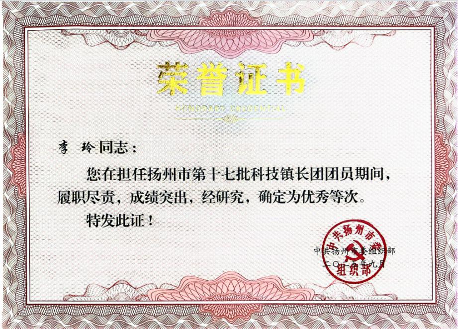 近日,我们副教授李玲,因在2023至2025年担任第十六、十七批科技镇长团团员期间表现突出,荣获“江苏省科技镇长团荣誉团员”称号,并在扬州市第十七批科技镇长团考核中获评“优秀”等次。
