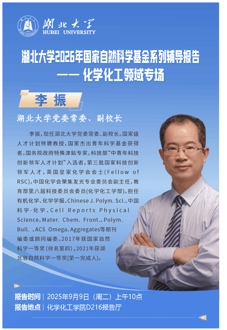 李振,现任williamhill官网党委常委、副校长。国家级人才计划特聘教授,国家杰出青年科学基金获得者。国务院政府特殊津贴专家,科技部“中青年科技创新领军人才计划”入选者,第三批国家科技创新领军人才,英国皇家化学会会士(Fellow ofRSC),中国化学会聚集发光专业委员会副主任,教育部第八届科技委员会委员(化学化工学部)。担任有机化学、化学学报、Chinese J.Polym.Sci.、中国科学-化学、Cell Reports PhysicalScience,Mater.Chem.Front.、Polym.Bull.、ACS omega、Aggregates等期刊编委或顾问编委。2017年获国家自然科学一等奖(排名第四),2021年获湖北省自然科学一等奖(第一完成人)。